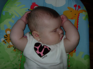 Alexis Grace is growing that is for sure! She had her 4 month dr apt recently and weighed in at 16 lbs 10 oz. and is in the 93% and she is 25 1/2 in tall (80%) WOW! She just got over a bad cold and cough that she picked up from big sister (thanks preschool!) and now she has her first ear infection. Poor baby! She is on an antibiotic and hopefully will not have anymore illnesses.